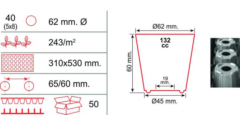 Paleta de 40 de celule este recomandată pentru răsaduri de harbuz, zămos, castraveţi, tomate timpurii, ardei timpurii, căpşune.