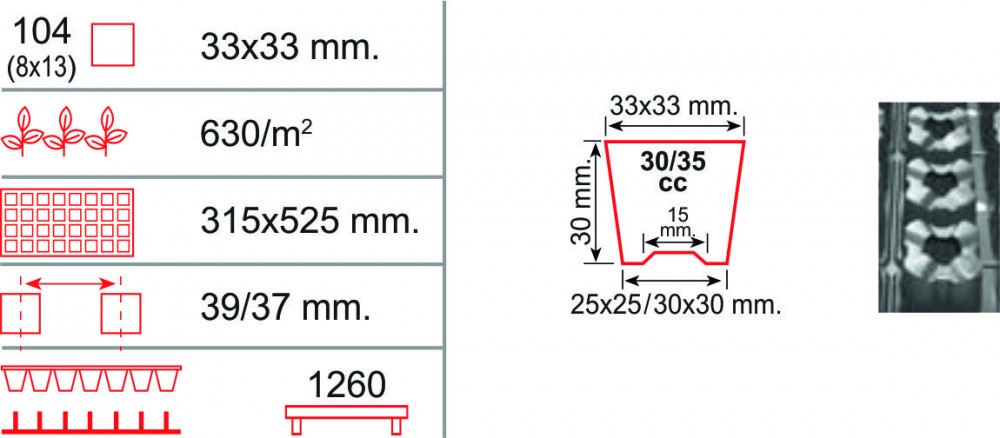 Paleta de 104 de celule este recomandată pentru răsaduri de tomate, varză, ardei, vinete. De asemenea această paletă este utilizată pentru semănarea directă a multor culturi cu scopul de a fi ţinute mai mult timp până la repicare. Avantajul acestei palete este numărul mare de plante obţinute pe suprafaţă: 630/m2.