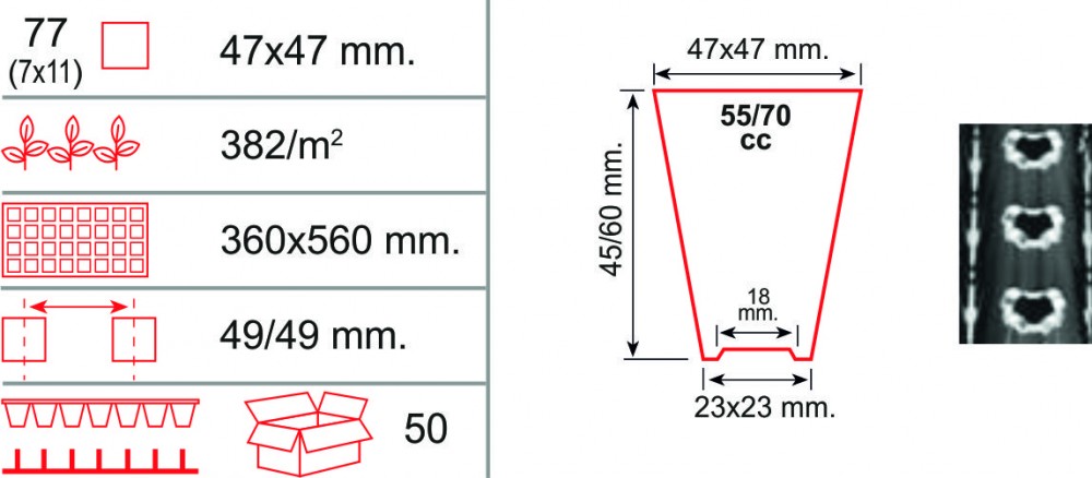 Paleta de 77 de celule este recomandată pentru răsaduri de harbuz, zămos, castraveţi, tomate timpurii, ardei timpurii. Răsadurile pot fi produse prin semănarea direct a seminţelor în celule sau prin repicare, însă cea mai utilizată metodă este semănarea direct. Această paletă economiseşte foarte mult spaţiu pentru producerea răsădurilor datorită dimensiunilor sale.