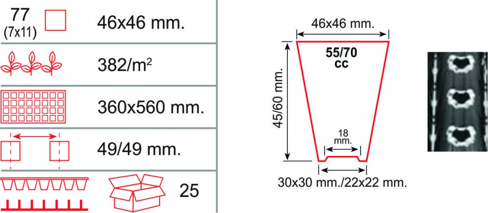 Paleta de 77 de celule este recomandată pentru răsaduri de harbuz, zămos, castraveţi, tomate timpurii, ardei timpurii.